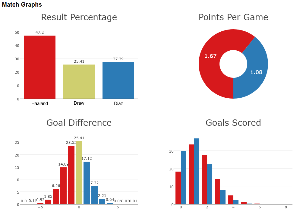 The Haaland team would expect to score on average 1.6 goals per match, while the Diaz team would be expected to score on average 1.2 goals per match. This does show that perhaps that adding a finishing metric could make a bit of a difference in adding accuracy but even in this is a purposefully extreme example, and the differences aren’t that large.