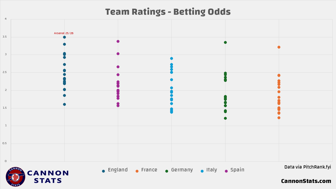 Arsenal are the team with the highest rating in the League and where they are right now isn’t all that special and other teams have been near the same level to where they are rated right now. What is unique this season is that the compression of the ratings and the lack of truly bad teams.